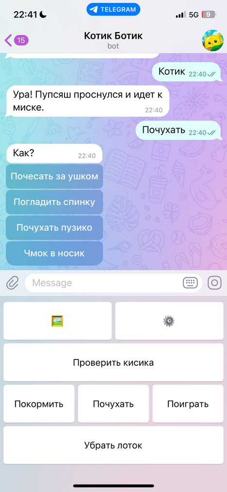 Welcome to the Telegram tamagotchi game «Cat bot»! It’s a kitten that lives in your phone. You can take care of your cat: feed, pet and play.